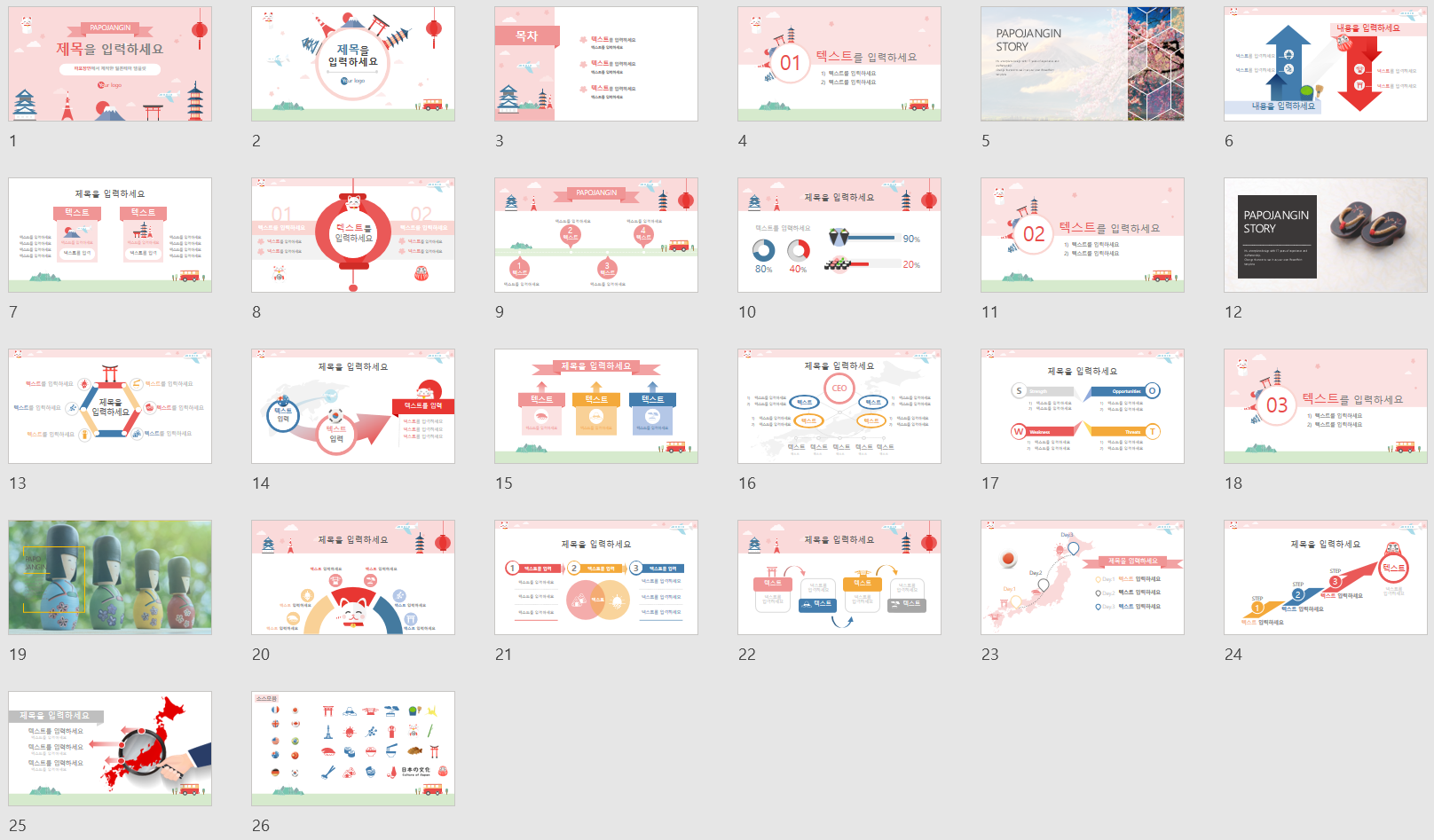 | 구성 | 표지2장, 고급 이미지컷 3장, 목차, 간지, 내지, 색상변경이 자유로운 아이콘 560개 제공 |